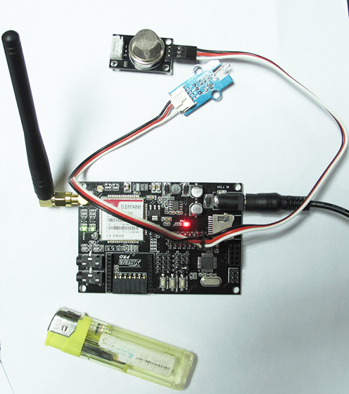 MQ2接在A0,LED接在A1。接上9V/2A適配器和FOCA轉串板,插入手機sim卡,最終如圖: