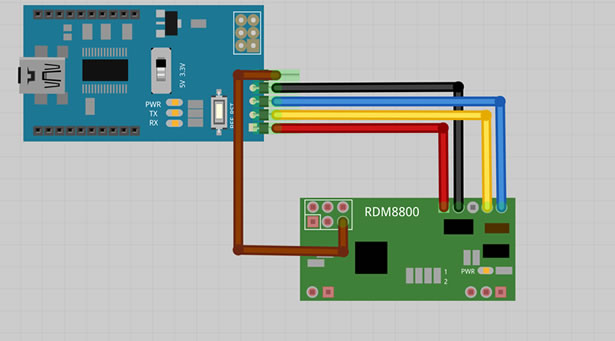 接下來,我們需要給RDM8800燒寫固件。按照下面的硬件連接圖來連接FOCA轉串板和RDM8800。注意:FOCA轉串板的開關要打到5V。詳細引腳定義請查閱datasheet和原理圖。