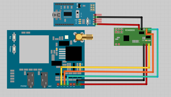 接下來是測試,拔掉電源線和所有杜邦線,按照下面的硬件連接圖來連接FOCA,RDM8800和SIM900模塊。