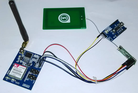 給SIM900模塊裝上SIM卡(僅支持聯通/移動sim卡)和天線,把NFC的天線板連接到RDM8800的接口上,然后插上USB線供電。實物如下圖: