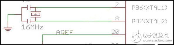 晶振連接Atmega8的pin9(PB6)、pin10(PB7),在分別連接連個22pF的電容,最后讓一只電容接地。 2、程序下載以及供電部分: