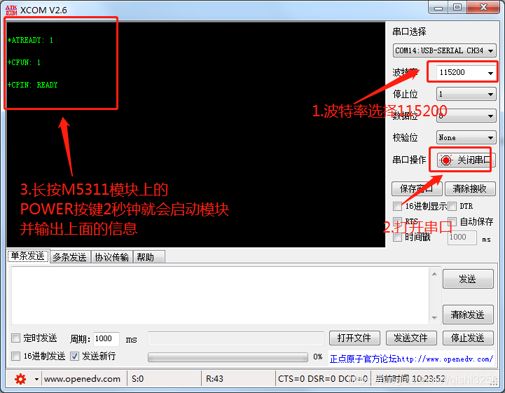 三、發送AT指令讓M5311模塊上線1.返回串口調試助手軟件那里,在輸入框輸入AT指令,然后發送,看看M5311模塊是否返回OK。如果沒有就按一下RST復位按鍵即可。
