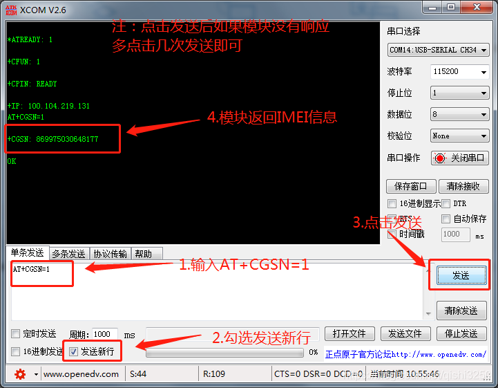 3.輸入AT指令獲取模塊的IMEI和IMSI