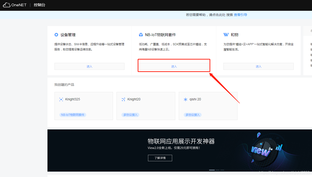 3.進入開發者中心后,點擊進入NB-IoT物聯網套件: