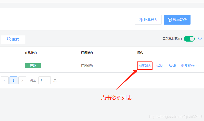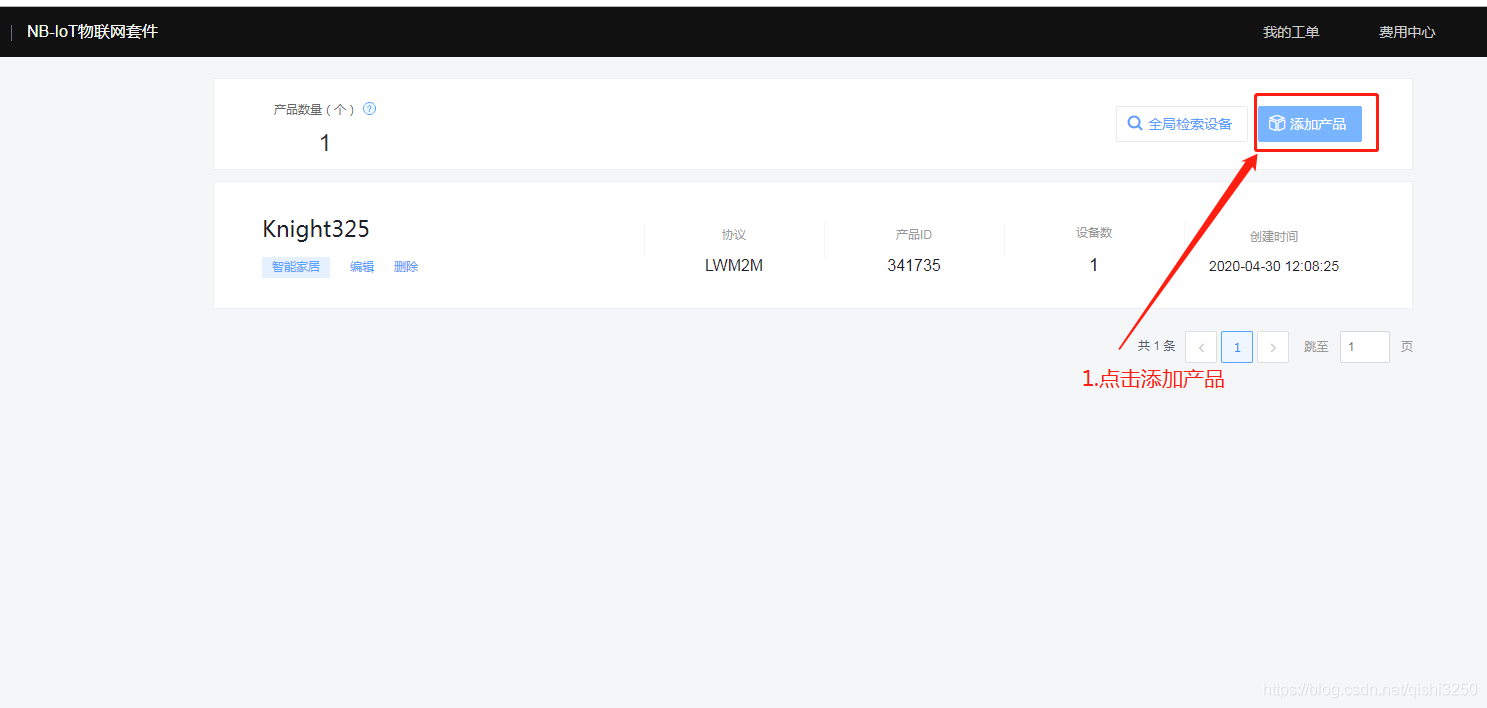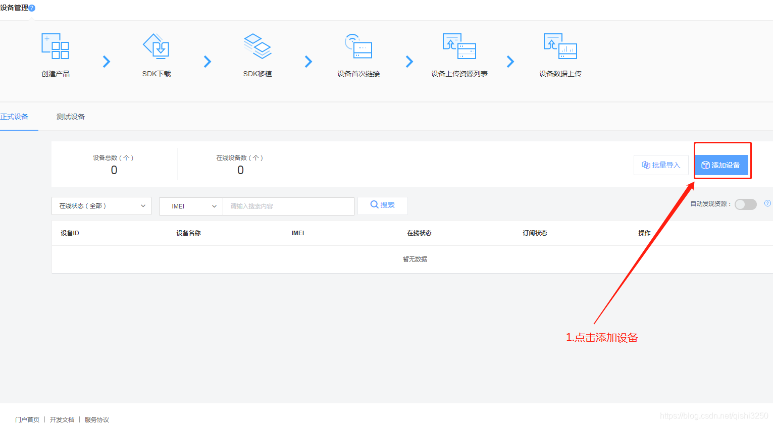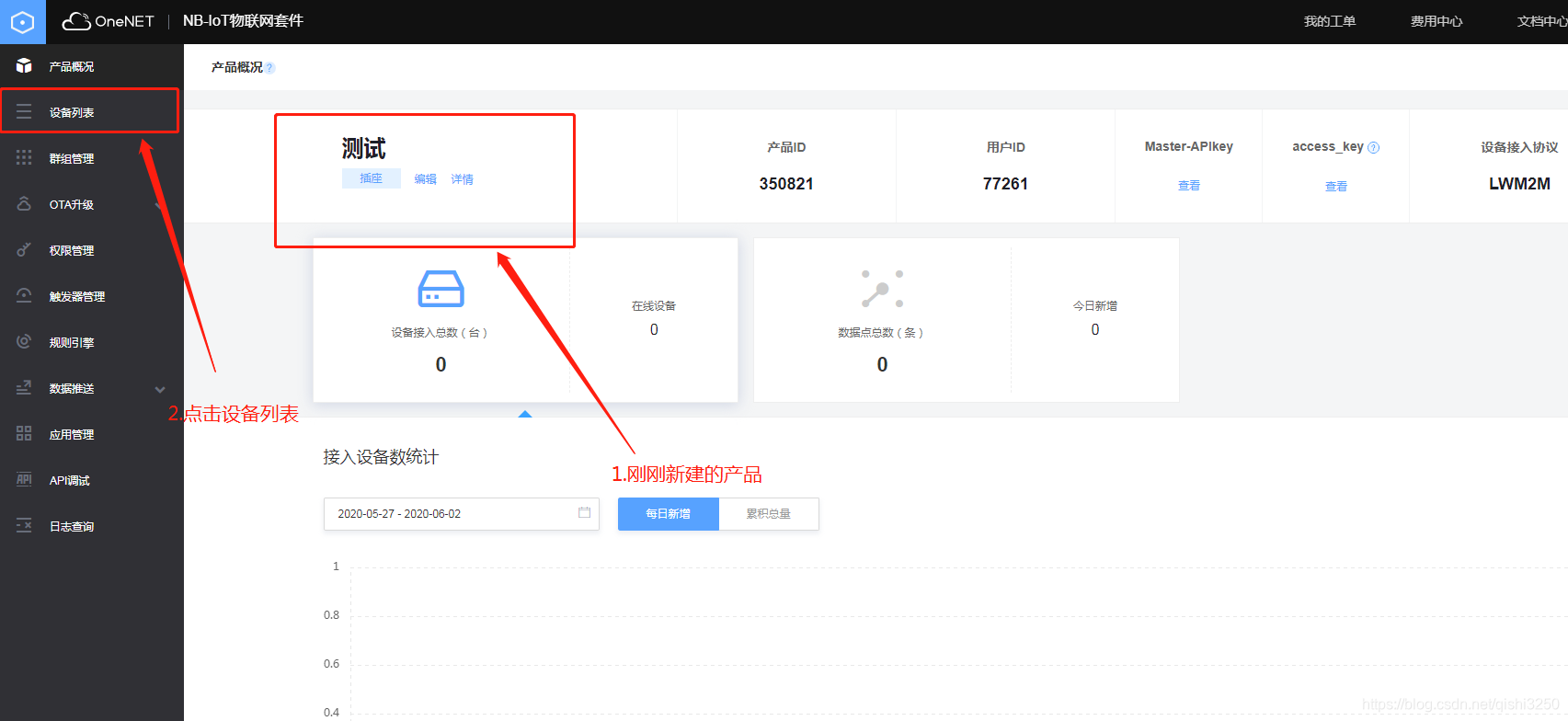 6.新建產品后,點擊產品的名字進入下圖頁面后,點擊左側的設備列表