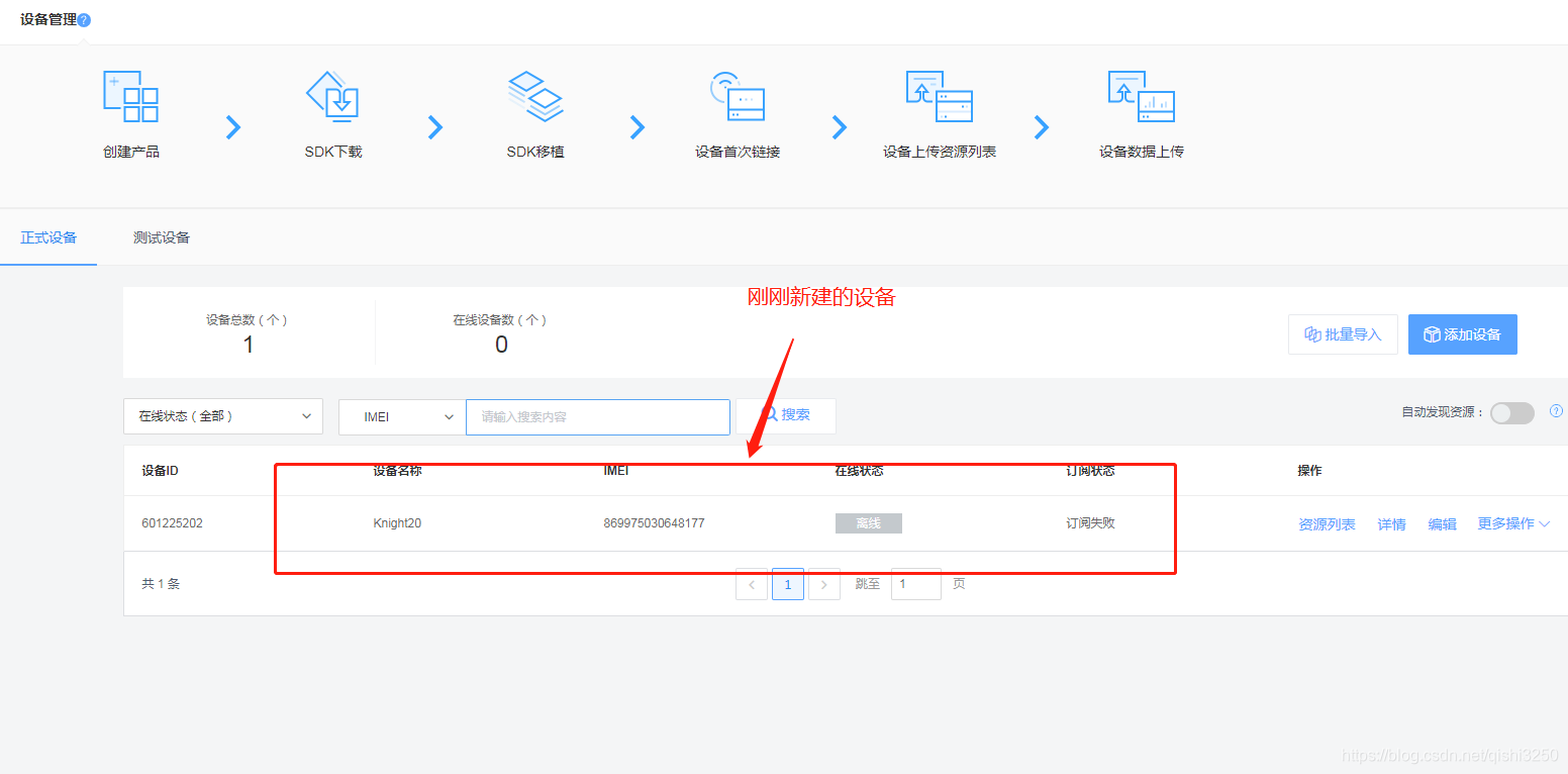 這個時候我們就可以看到剛剛新建的設備了,顯示為離線及訂閱失敗!接下來通過串口調試助手讓設備上線!!!