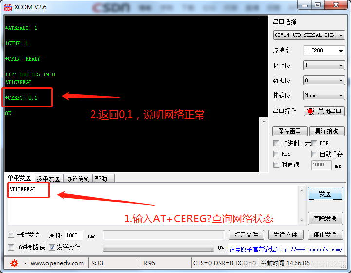 然后再輸入框輸入AT+CEREG?,用于查詢M5311模塊的網絡狀態: