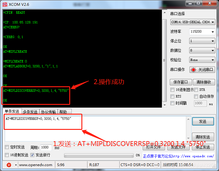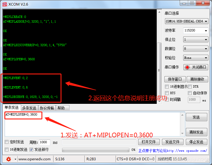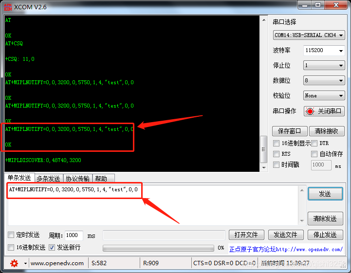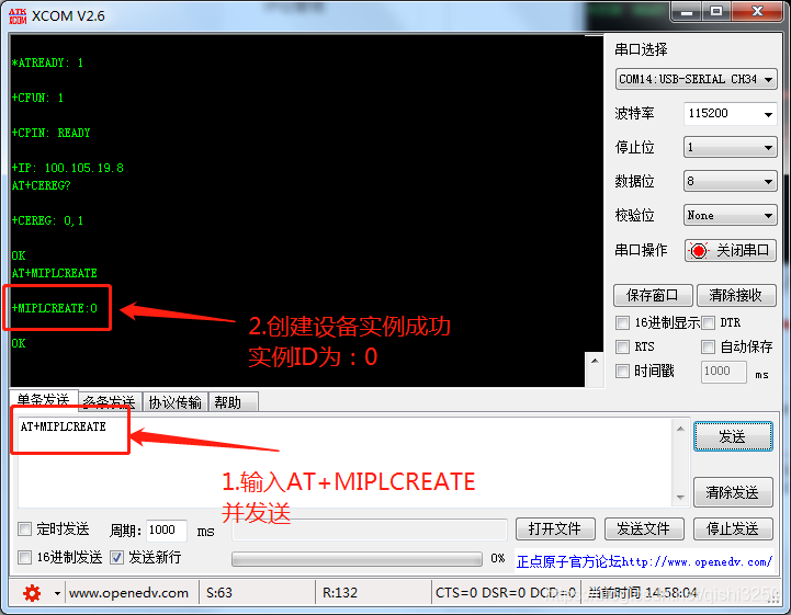 2.在輸入框輸入:AT+MIPLCREATE,并發送