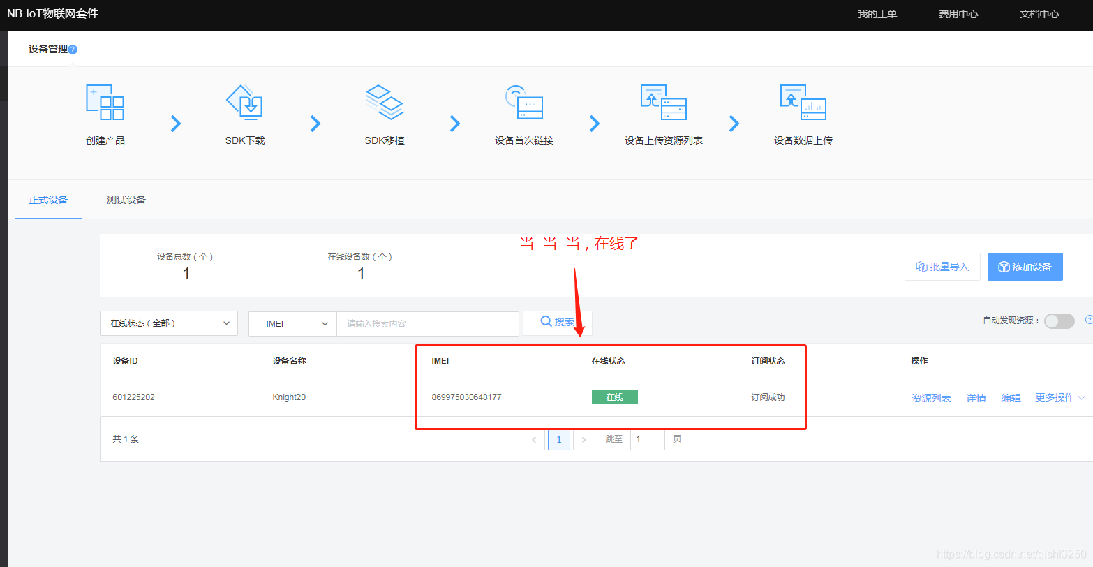 這個時候進入Onenet的后臺就可以看到設備顯示在線了!