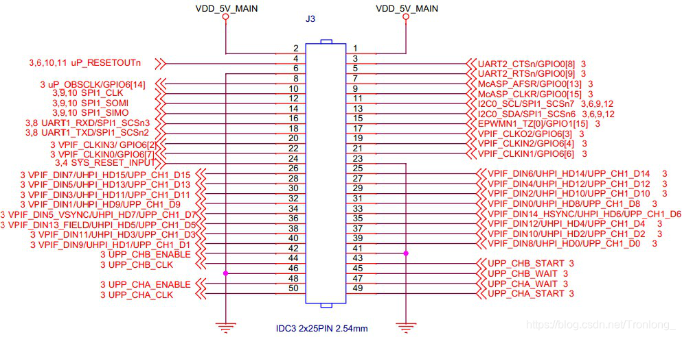 J3提供了GPIO、SPI、I2C、uPP、UART等拓展信號,方便客戶實現功能模塊拓展,比如外接CMOS攝像頭、FPGA高速數據采集板卡等模塊、多通道DA模塊,引腳定義如下圖: