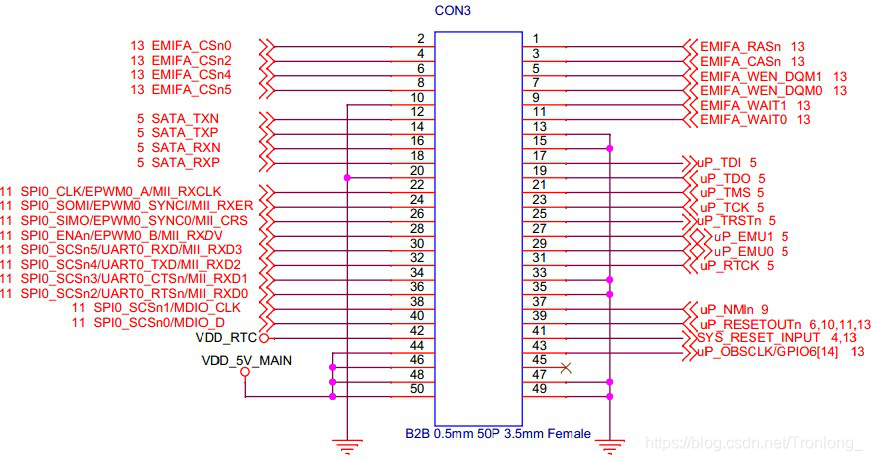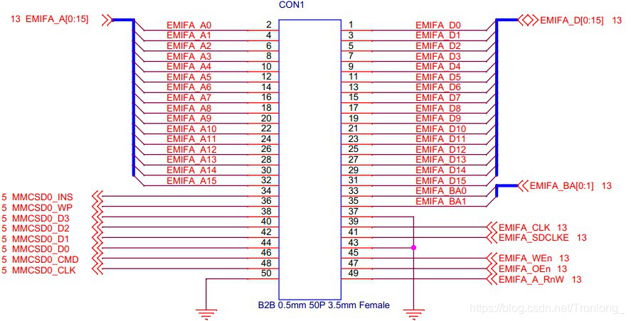 底板B2B連接器開發板底板上有4個50pin、0.5mm間距的B2B連接器,其中CON1和CON3是母座,CON2和CON4是公座,用于和核心板連接,以下為底板各個B2B的引腳定義:
