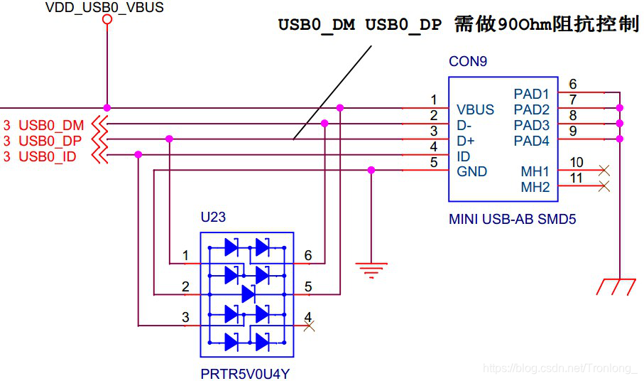 USB接口CON9是Mini USB 2.0 OTG接口,理論速度480Mbps,主要應用于各種不同的設備或移動設備等從設備間的連接,進行數據交換。其引腳定義如下圖: