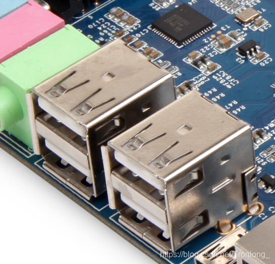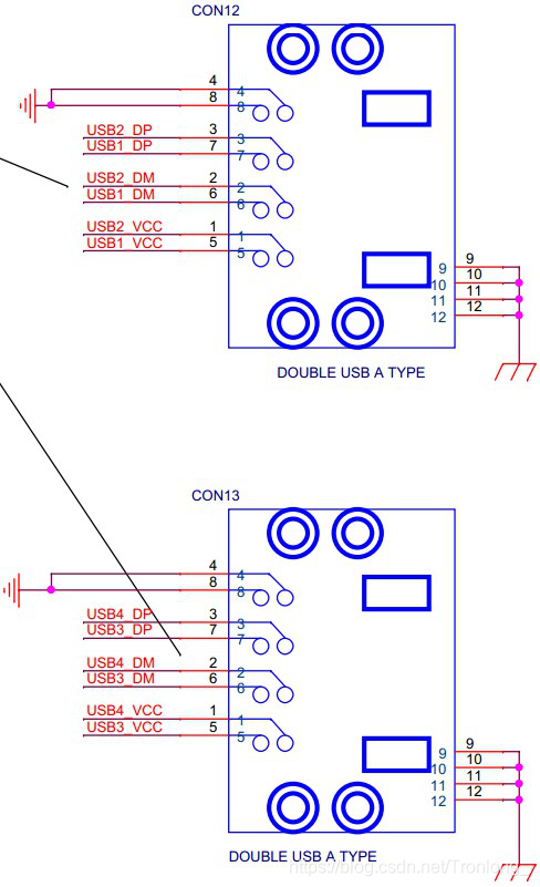 CON12和CON13是2個雙層USB接口,共4個A型USB 1.1 HOST,理論速度12Mbps,它和普通PC的USB接口是一樣的,可以接USB攝像頭、USB鍵盤、USB鼠標、U盤等常見的USB外設。這4個USB HOST是由一個USB Hub芯片擴展得到的。[url=]其引腳定義如下圖:[/url]