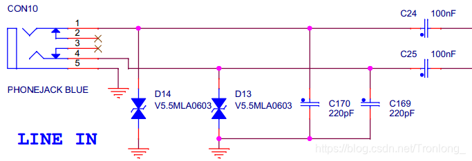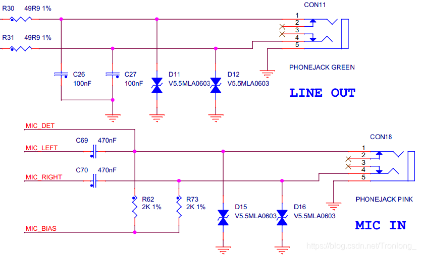 音頻輸出輸入接口開發板帶有音頻輸入和輸出接口,使用TLV320AIC3106IRGZ音頻芯片。CON10為Line in音頻輸入接口,CON11為Line out音頻輸出接口,CON18為Mic in音頻輸入接口。以上三者均使用3.5mm直徑接口,實圖和原理圖如下: