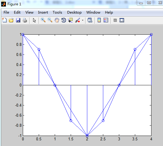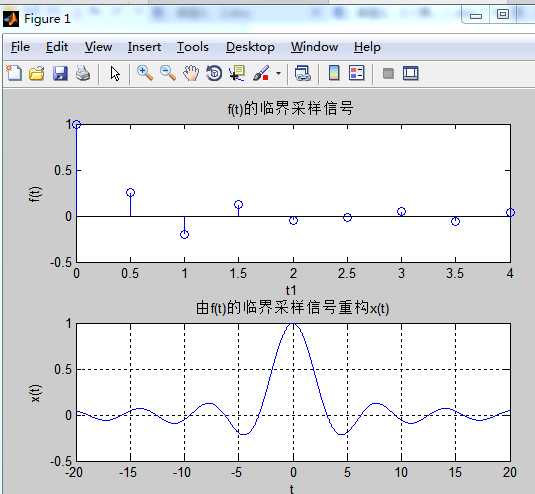 t=0:2:4; x=cos(0.5*pi*t); plot(t,x) hold on; stem(t,x) t=0:0.5:4; x=cos(0.5*pi*t); plot(t,x) hold on; stem(t,x) wm=1; %升余弦脈沖信號帶寬 wc=wm; %頻率 Ts=pi/wm; %周期 ws=2.4*pi/Ts; %理想低通截止頻率 n=-100:100; %定義序列的長度是201 nTs=n*Ts %采樣點 f=sinc(nTs/pi); %抽樣信號 Dt=0.005;t=-20:Dt:20; fa=f*Ts*wc/pi*sinc((wc/pi)*(ones(length(nTs),1)*t-nTs'*ones(1,length(t)))); %信號重建 t1=0:0.5:4; f1=sinc(0.5*pi*t1); subplot(211); stem(t1,f1); xlabel('t1'); ylabel('f(t)'); title('f(t)的臨界采樣信號'); subplot(212); plot(t,fa) xlabel('t'); ylabel('x(t)'); title('由f(t)的臨界采樣信號重構x(t)'); grid;