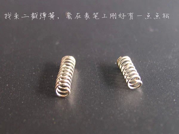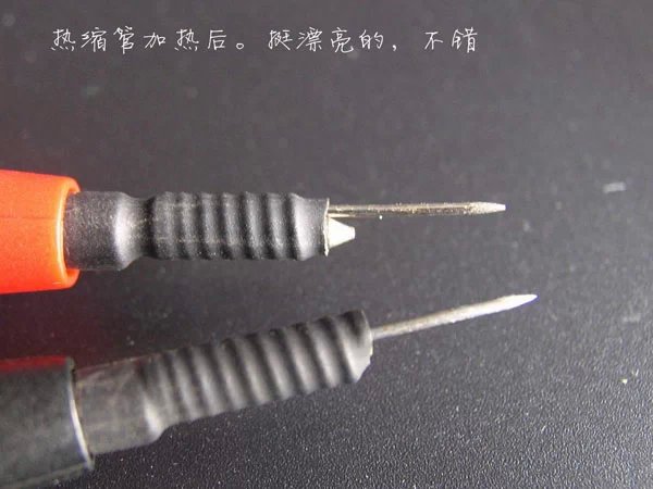 測量電路板比較小的測量點時,很不方便。經常會誤碰到旁邊的測量點上。后來試過把大頭針用銅線綁在表針上(不想直接在表針上焊錫。)用線綁的會用著用著就松了,后來想到了用彈簧來固定大頭針,再來熱縮管套上,非常漂亮,也實用。但是用大頭針有個缺點,大頭針太脆了。一不小心掉地上就會摔斷或摔彎了。為了這個想了不少辦法,可手上都沒有合適的材料來代替大頭針。