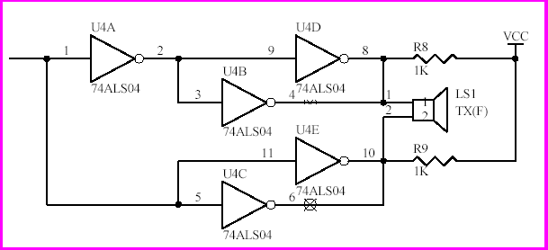 我現在在做超聲波測距,用的是非門 + CX20106A方案。發射部分用非門驅動,如下