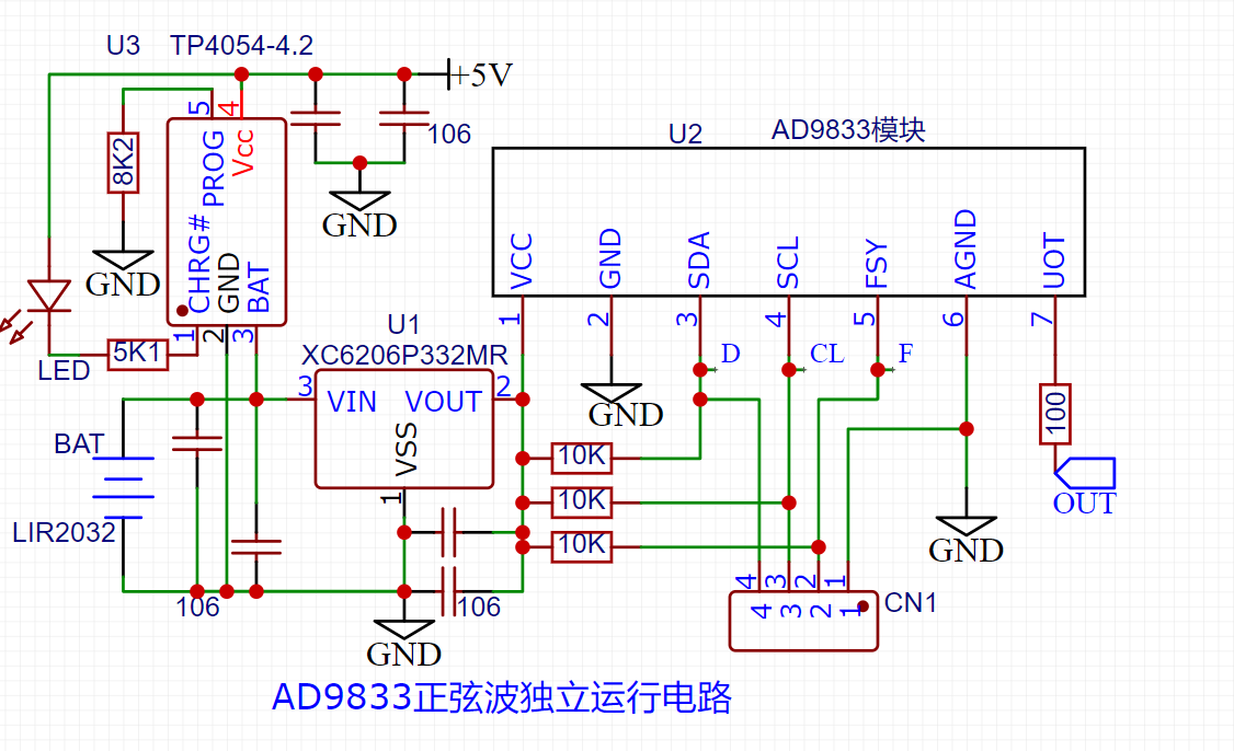 設計了一款正弦波輸出電路,但遺憾的是必須與單片機配合使用!這對體積有要求的應用場合很麻煩!于是設計制作了這款電路。AD9833只要保持VDD端供電,就可以脫離單片機獨立運行設置好的參數!這款電路使用一粒充電電 ...