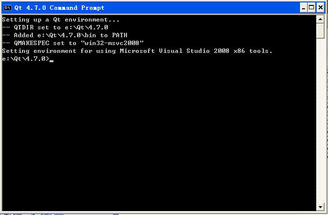 安裝好了后,直接在開始菜單中運行Qt 4.7.0 Command Prompt 命令行,啟動控制臺窗口