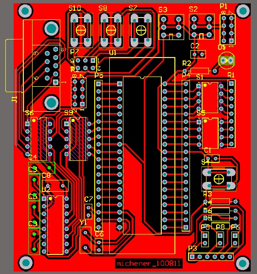 這塊板子是兩個多月之前設(shè)計的了,那時在學(xué)Altium designer、51單片機(jī),還有模電等等,所有東西都是剛剛接觸,因此在設(shè)計上存在很多不足。現(xiàn)在把它發(fā)上來主要想說明一下AT的單片機(jī)也是通過串口直接下載程序的,網(wǎng)上有不少人說只能通過專門的下載線下載程序,我現(xiàn)在是辟謠~·呵呵。相信有一定基礎(chǔ)的同學(xué)應(yīng)該可以看出上面兩個撥碼開關(guān)那部分電路,是可以簡化的,嘿嘿~~被人看穿啦~~~