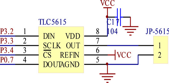 在WSF-51DB開(kāi)發(fā)板上,TLC5615的輸出端不接任何負(fù)載,只是擴(kuò)展了一個(gè)接口,作為測(cè)量?jī)x器的接口。芯片的基準(zhǔn)電壓取自電源電壓DC5V。