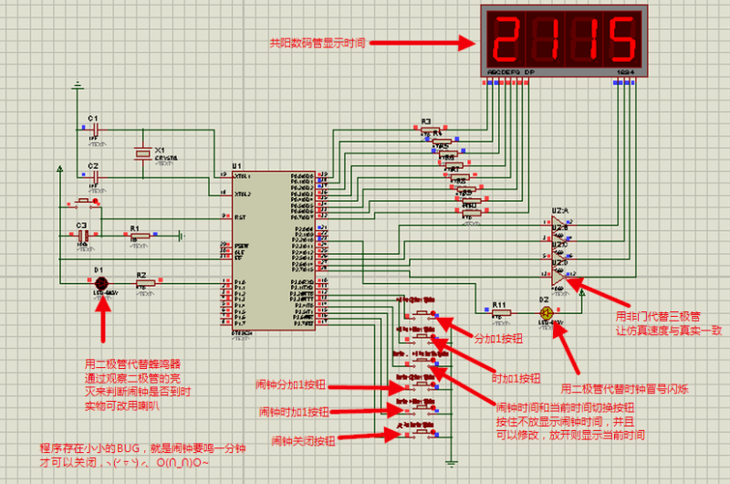 經(jīng)過(guò)幾天的努力,第一個(gè)51單片機(jī)電子時(shí)鐘終于出爐了,通過(guò)4位數(shù)碼管來(lái)顯示時(shí)間,系統(tǒng)晶振11.0592MHZ,仿真圖中用二極管代替時(shí)鐘冒號(hào)閃爍,非門代替三極管,讓仿真速度與真實(shí)速度達(dá)到一致,本設(shè)計(jì)用了6個(gè)按鈕來(lái)對(duì)時(shí)間及鬧鐘時(shí)間的調(diào)節(jié)、關(guān)閉,p3.2接時(shí)間分加1按鈕,p3.3接時(shí)間時(shí)加1按鈕,p3.4接鬧鐘時(shí)間與當(dāng)前時(shí)間切換按鈕,按住不放顯示鬧鐘的時(shí)間,鬧鐘初始化為00:00,放開按鈕則顯示當(dāng)前時(shí)間,p3.5接鬧鐘加1按鈕,p3.6接鬧鐘時(shí)加1按鈕,p3.7接關(guān)閉鬧鐘按鈕