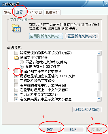2:把[隱藏已知文件的擴展名]選項前面的勾去掉.