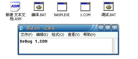 雙擊運行BAT文件.如果你之前的步驟都沒做錯的話,就會發(fā)現(xiàn)多出一個COM文件.不要急著運行它!這個就是你的代碼編譯出來的東西!你知道么?DeBug還能調(diào)試編譯出來的程序呢!我們用DeBug調(diào)試它吧,再次建立一個BAT文件,用記事本按照以下語法寫入內(nèi)容: