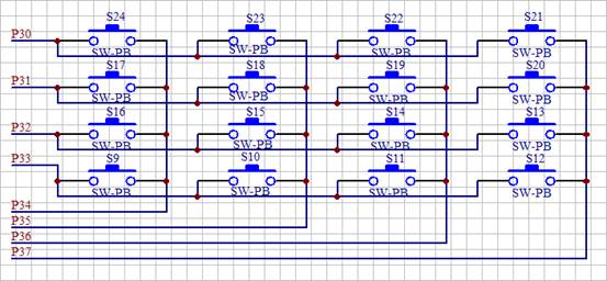 非編碼鍵盤通常又分為獨立鍵盤和矩陣鍵盤兩大類。所謂獨立鍵盤是指按鍵在與單片機相連時,每一個按鍵都與一個單片機單片機的I/O口相連,如圖3所示;而對于一些應用系統中若需要較多按鍵時,采用獨立鍵盤的連接方法,則比較耗費單片機的I/O口,此時我們一般會用到矩陣鍵盤,如圖4所示,16個按鍵排成4行4列,稱為4X4矩陣鍵盤,如按獨立按鍵法,需要16個I/O口,而按圖4的接法只需要8個I/O.
