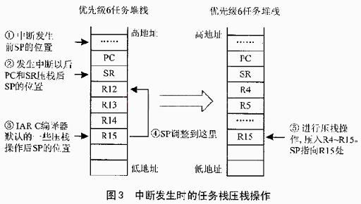 圖3所示為中斷發生后對于任務優先級為6的任務堆棧所進行的操作。中斷發生后,PC和SR被系統壓棧②,對于IAR C編譯器來說,會按照復雜度不同的中斷服務程序的要求,默認地進行一些寄存器的壓棧操作③。因為我們要求的堆棧格式是如圖2所示的,我們要把SP調整到 SR后面④,然后進行R4~R15的壓棧操作,形成我們所要求的堆棧格式⑤。
