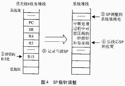 進行任務堆棧的壓棧工作以后,就可以調整SP的指針到系統堆棧了,如圖4所示。壓棧后的SP指向最后一個壓棧內容①。我們把SP的值賦值給優先級6任務的TCB->OSTCBStkPtr,以便進行任務調度的時候出棧使用②。接著,就把SP調整到系統堆棧處③。在中斷處理過程中,可能會出現壓棧的操作,那么這種情況下SP的指針會隨之移動。由于現在是中斷堆棧中,所以不會破壞任務堆棧的格式。