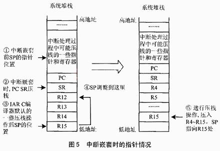 如果是在中斷中調用中斷服務子程序的話,編譯器將把當前執行語句的PC壓棧,同時再把SR壓棧。接著,根據中斷服務子程序的復雜程度,選擇把 R12~R15中的寄存器壓棧。然后,執行中斷服務子程序。中斷處理結束后再把Rx寄存器出棧,SR出棧,PC出棧。把系統恢復到中斷前的狀態,使程序接著被中斷的部分繼續運行。