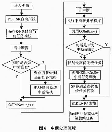 如圖5所示,由于在處理中斷的時候,SP已經被移到系統堆棧去了,只有當中斷退出的時候才可能把SP移到別的任務的任務堆棧中。所以在中斷的時候進行中斷嵌套,那么對于中斷的處理和第一次是一樣的,所不同的是,這次保存在堆棧中的不是任務運行中的寄存器,而是中斷處理中的寄存器,而且是保存在系統堆棧中而不是任務堆棧中。從這里就可以看出優化內存的效果。所有的中斷嵌套中的寄存器壓棧都壓在系統堆棧中,這樣對于任務堆棧內存大小的要求大大降低。
