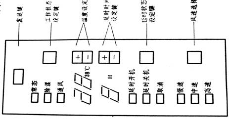 (2) 工作狀態指示器3組:第一組指示設定的工作狀態:常態、除濕、通風;第二組指示延時開機、延時停機、取消等三種延時要求;第三組指示空調機的三種工作速度:慢速、中速、高速。