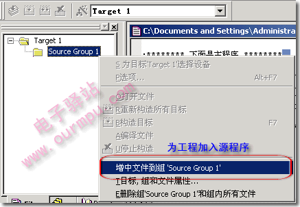 第七步:加入源程序到工程中。在選擇好CPU型號后,點擊"確定"按鈕返回主界面,此時可見到工程管理窗中出現“Target 1”,點擊“Target 1”前面的“+”號展開下一層的“Source Group 1”文件夾,此時的新工程是空的,“Source Group 1”文件夾中什么文件都沒有,必須把剛才輸入的源程序加入到工程當中。如圖9所示,右擊工程管理窗中的“Source Group 1”,出現下拉菜單,點擊“增加文件到組'Source Group 1'”命令,將出現添加文件對話框(圖10)。