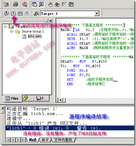 至此,我們已經完成了從源程序輸入、工程建立、工程詳細設置的工作,接下來我們將完成最后的步驟,此時我們可以在文本編輯窗中繼續輸入或修改我們的源程序,使程序實現我們的目標,在檢查程序無誤后保存工程。接著如下圖19所示,點擊“構造目標”快捷按鈕,進行源程序的編譯連接,源程序編譯相關的信息會出現在輸出窗口中的“構造”頁中。下圖19顯示編譯結果為0錯誤,0警告,同時產生了目標文件lich1.hex。如果源程序中有錯誤,則不能通過編譯,錯誤會在輸出窗口中報告出來,雙擊該錯誤,就可以定位到源程序的出錯行,我們可以對源程序進行反復修改,再編譯,直到沒有錯誤為止。注意:每次修改源程序后一定要保存。