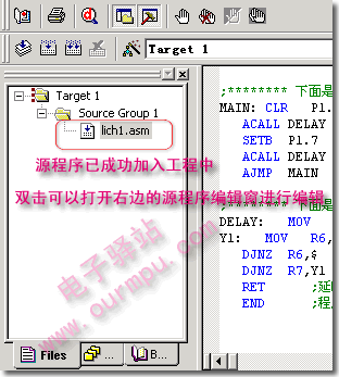 當給工程添加源程序文件成功后,工程管理器中的“Source Group 1”文件夾的前面會出現一個“+”號,單擊“+”號,展開文件夾,可以看到lich1.asm已經出現在里面,雙擊即可打開該文件進行編輯修改源程序(見圖13)