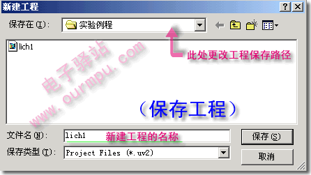 在保存工程對話框中輸入你的工程的文件名,Keil工程默認擴展名為".uv2",工程名稱不用輸入擴展名(見圖7),一般情況下使工程文件名稱和源文件名稱相同即可,輸入名稱后保存,將出現"選擇設備"對話框(圖8),在對話框中選擇CPU的型號。