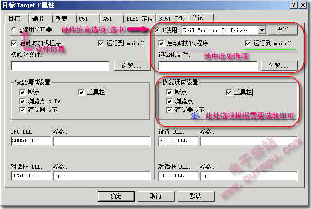 3、工程調試設置。“調試”頁面設置如下圖17所示。該頁分為左右兩半,左半邊是軟件仿真設置,而右半邊是硬件仿真設置,當你使用軟件仿真時,選中左邊的“S使用仿真器”;如果你使用硬件仿真器,那么就按下圖所示設置硬件仿真,同時把仿真器連接到你的電腦串口上。