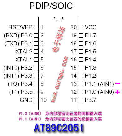 AT89C2051是精簡版的51單片機,精簡掉了P0口和P2口,只有20引腳,但其內部集成了一個很實用的模擬比較器,特別適合開發精簡的51應用系統,畢竟很多時候我們開發簡單的產品時用不了全部32個I/O口,用AT89C2051更合適,芯片體積更小,而且AT89C2051的工作電壓最低為2.7V,因此可以用來開發兩節5號電池供電的便攜式產品。