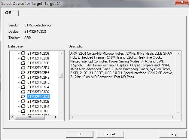 6、接下來會彈出讓你選擇器件的窗口,這里我們選擇 STmicroelectronics 的 STM32F103C8
