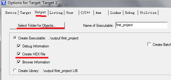 在output 選項下,在create HEX file 前打上鉤, 點擊select Folder for Objects 選擇輸出文