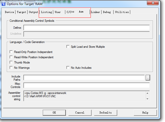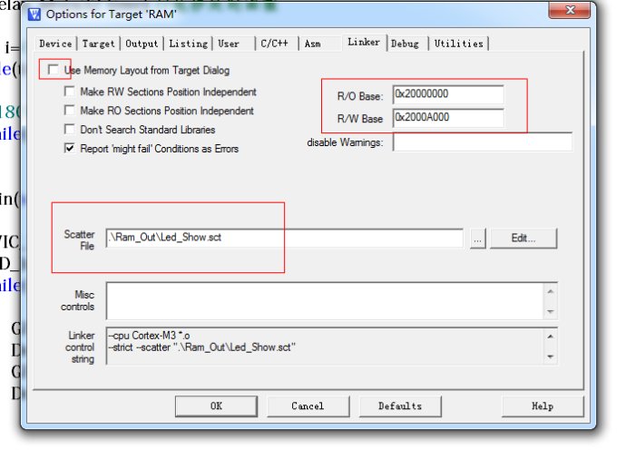6.Linker 菜單下,這里要注意,先不勾選Use memory Layout Form Targer Dialog,是為了要更改ROM和RAM的起始地址,配置如下。配置好了,再把其勾上。可以前后連接文件下對比XXX.sct文件,可以看到地址是變化的。