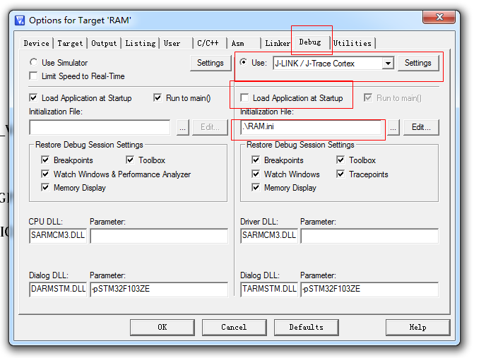 7.Dubug處設(shè)置如圖所示,調(diào)試工具是什么選什么,Load Application at Startup處,如果勾選了,就不能單步調(diào)試,程序會直接運(yùn)行。這里關(guān)鍵就是要加入一個RAM.ini文件,作為RAM的配置文件,是起到復(fù)位指針作用。這個文件是每次不同的工程都要修改,更改方框中的工程名。這個文件可以自己記事本寫,寫上圖示幾行代碼,或者到D:\Keil\ARM\Boards\Keil\MCBSTM32\STLIB_Blinky路徑下拷貝過來,修改一下。還要注意一點(diǎn)就是,axf文件的路徑要搞清楚。是在項(xiàng)目根文件還是在子文件中,axf文件前面要指定路徑。