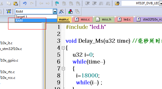 2.選中剛才建立的RAM調(diào)試模式,為什么要這樣做呢?學(xué)習(xí)過DSP的同學(xué)都清楚,這里是模仿DSP項(xiàng)目調(diào)試中的兩種方式,是為了有多鐘調(diào)試模式,F(xiàn)lash模式,RAM模式。